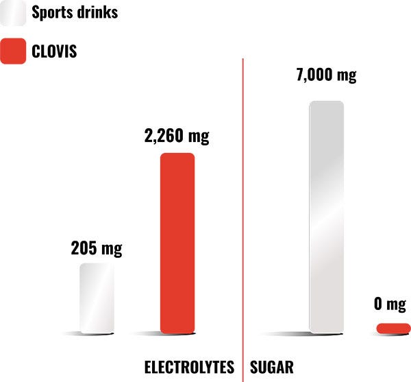 Can you believe it?! Clovis Essential Electrolytes contains more than 10x the electrolytes found in leading sports drinks and zero sugar.
