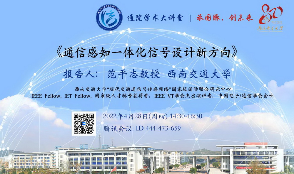 2022年4月28日星期四下午,公司将邀请IEEEVT学会杰出演讲者、国家级人才称号获得者、中国电子/通信学会会士、西南交通大学范平志教授来公司作“通信感知一体化信号设计新方向”专题报告。本次报告旨在加强学术交流,帮助员工开拓科研思路,了解相关领域的学术前沿,优化学术体系,是公司开展“通院学术大讲堂”校庆系列报告会的又一精彩内容。