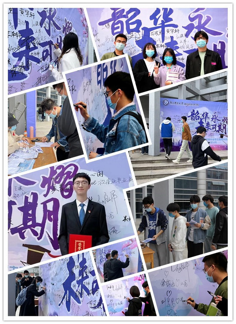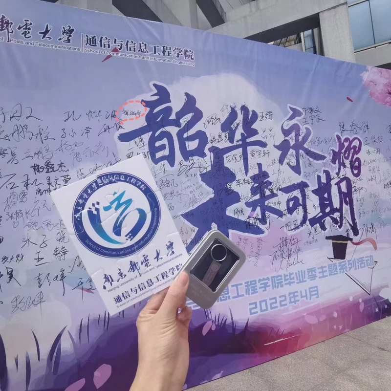 鼎山脚下、眼镜湖旁,山山水水、点点滴滴、朝朝暮暮、年年岁岁,在南邮的每一分每一秒都值得被珍藏。科研楼门前设有签名展板供同学们合影留念,一张张照片定格相伴的岁月,一份份祝福相伴未来的路途,伴随着所有的喜悦与泪水,构成了这份美好的南邮记忆。