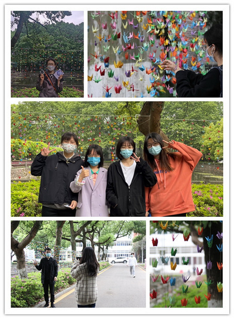 毕业生在8000只纸鹤前合影