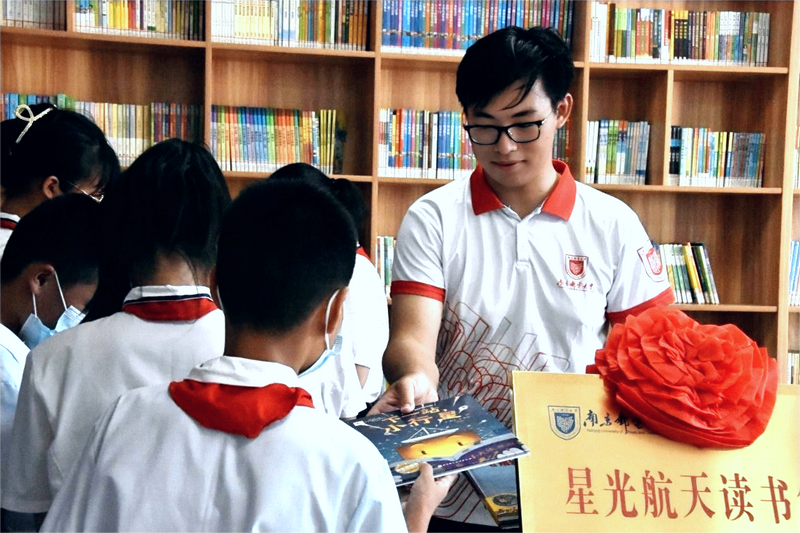 实践团成员在为都会小学员工们赠送航天科普图书