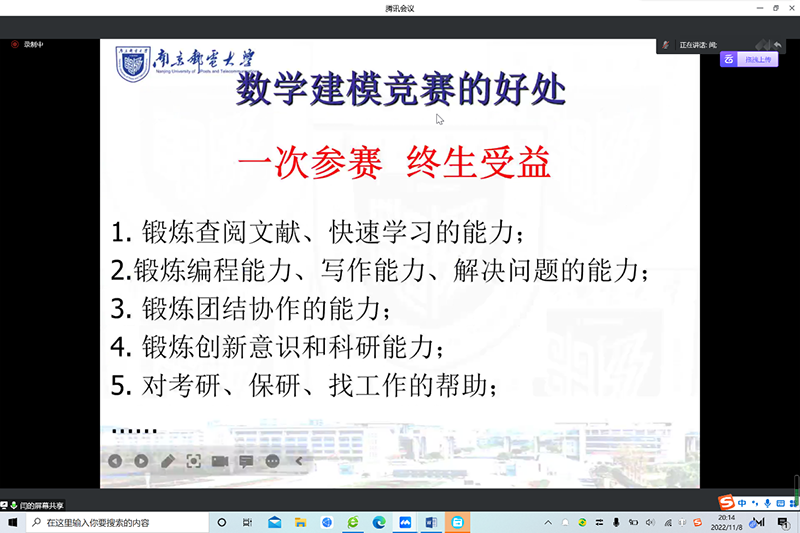 11月8日晚,学院邀请资深数模竞赛指导教师闫庆伦老师为B210117-B210120班开展数学建模竞赛指导讲座,班主任吕斌老师、吴晓欢老师,辅导员周宇老师及B210117-B210120班全体同学参会。