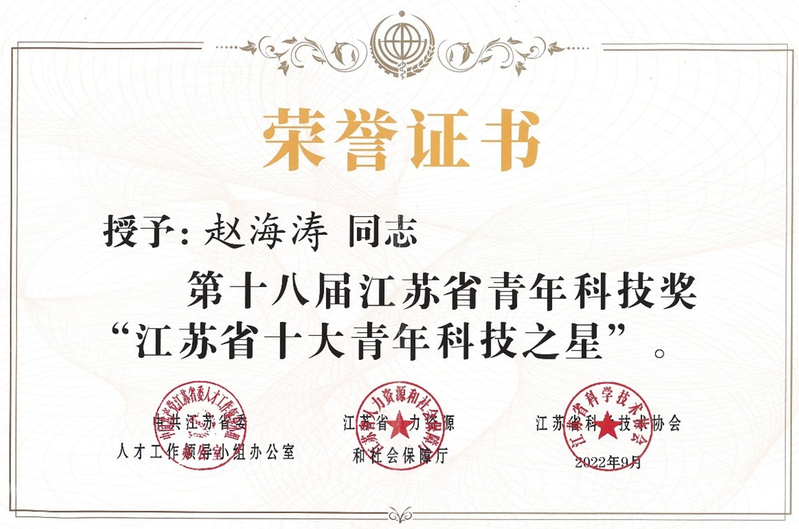 11月30日,第九届江苏省青年科学家年会在常州举行。开幕式上,表彰了第十八届江苏省青年科技奖获奖者及“十大青年科技之星”,公司bw西汉姆联副经理、教授、博士生导师赵海涛荣获“江苏省十大青年科技之星”称号。
