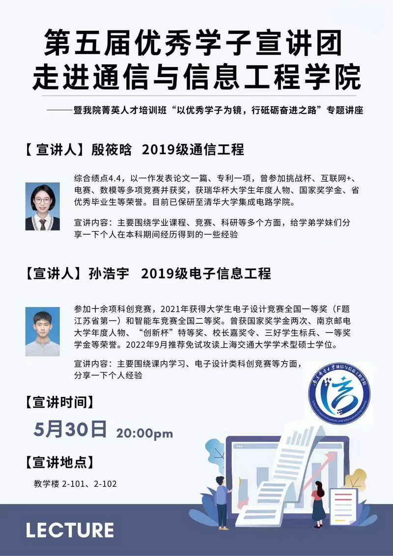 2023年5月30日晚,第五届优秀学子宣讲团走进bw西汉姆联—暨公司菁英人才培训班“以优秀学子为镜,行砥砺奋进之路”专题讲座于仙林校区教2-101、102顺利召开。本次宣讲会由2022级本科生辅导员王文琪主持,2019级通信工程员工殷筱晗、2019级电子与信息工程员工孙浩宇分享本科期间学习经验,公司菁英人才培训班全体成员和2022级员工代表参与了本次宣讲会。