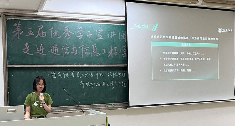 宣讲伊始,由已保研至清华大学集成电路学院殷筱晗同学围绕学业课程、竞赛、科研等多个方面,讲述了她的本科学习经历。殷筱晗同学曾以第一作者的身份发表了一篇SCI论文,拥有专利一项,同时在挑战杯、数学建模、电子设计等比赛中取得过多个国家级和省级奖项。她强调了在本科学习阶段绩点的重要性,希望同学们能重视每一门课,打好自己的专业基础。在学习方法层面,她强调找到适合自己的学习方法和学习节奏的必要性。在竞赛科研层面,学校“无挑战,不青春”的科创氛围给予其创新思维提供了沃土,科研是一个主动的过程,需要同学充分发挥主观能动性,利用自己擅长的方面参与到实验和项目中去,主动认领任务、迎接挑战。