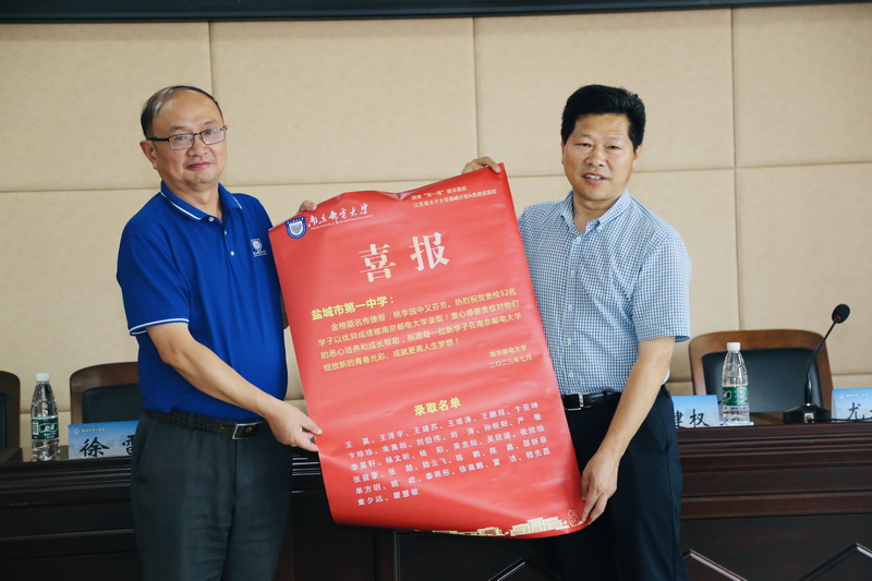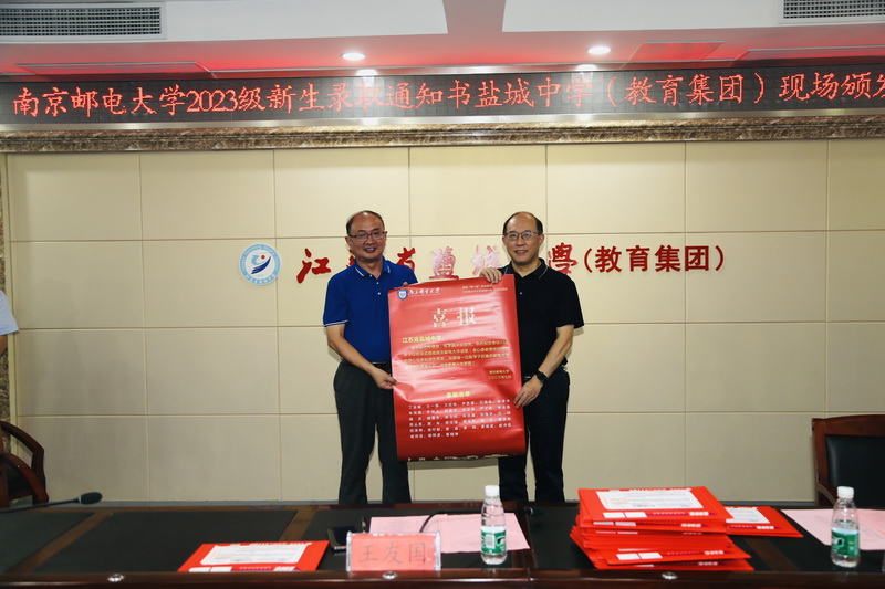 江苏省盐城中学(教育集团)党委书记、董事长丁才林,副董事长朱俊、李生,纪委书记孙思,盐城市实验高级中学高三年级主任蔡今春,盐城市第一中学党委书记、董事长陈建权,副董事长尤为军等相关领导,公司盐城招生组组长、通信与信息工程公司党委书记徐雷,公司团委书记秦昌建及相关老师参加了颁发仪式。仪式上,中学董事长们分别致辞对王董事长一行表示热烈欢迎,对南邮浓厚的红色底蕴、悠久的办学历史以及社会评价良好的高质量就业表示高度赞赏,对考取南邮的优秀学子表示祝贺,希望同学们在进入大学的学习生活后踔厉奋发,为母校增光添彩。
