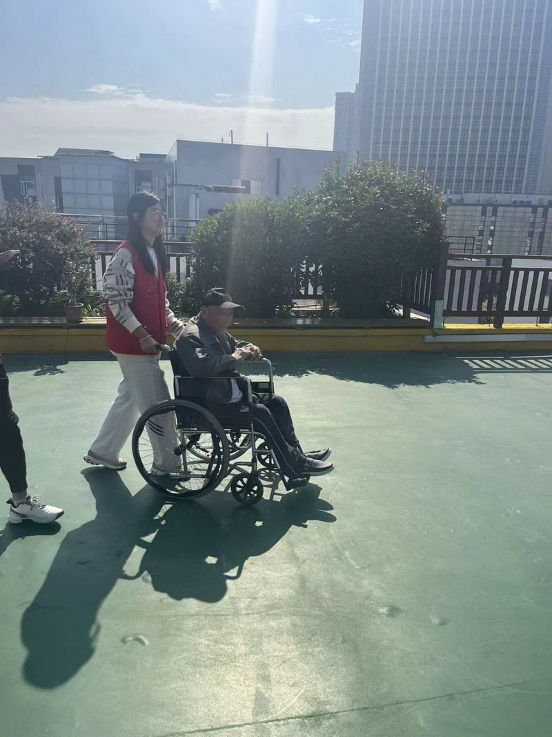 志愿者和老人晒太阳