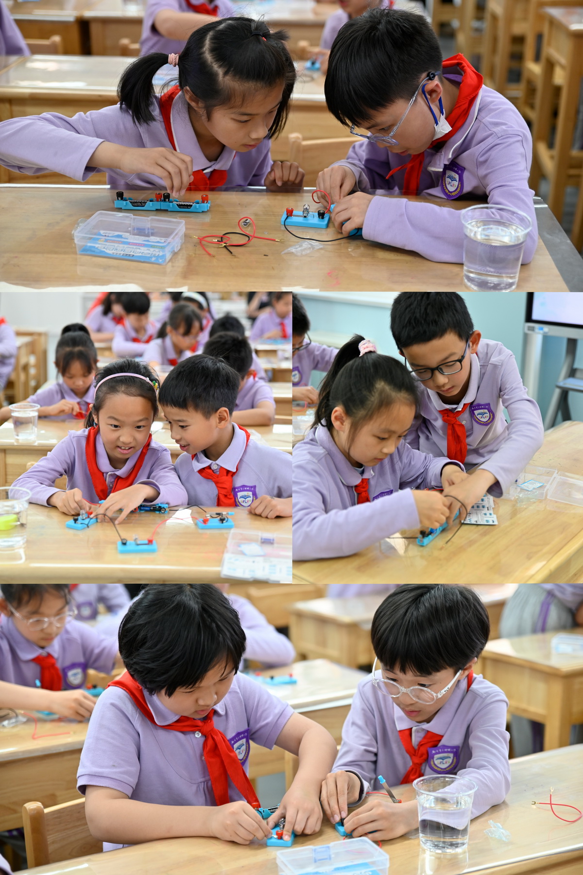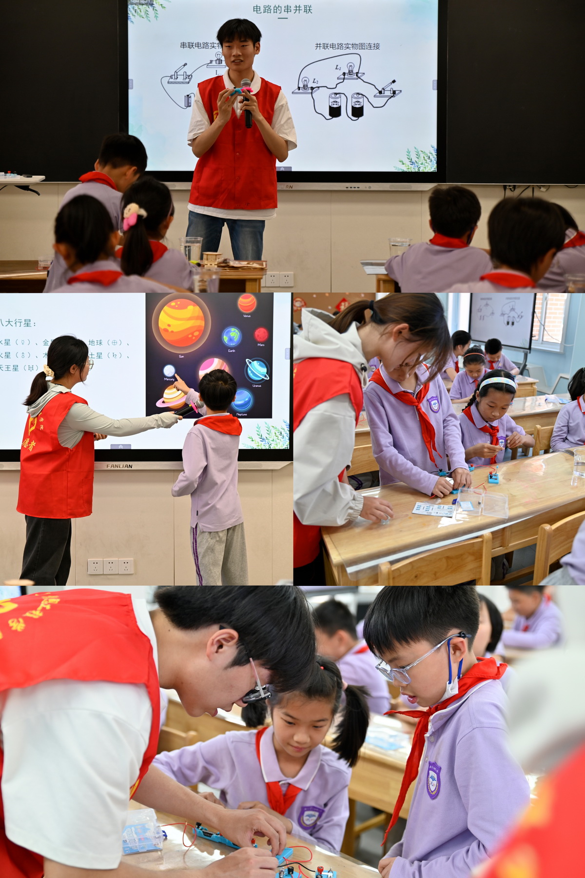 紧随其后的科普实践环节是由学院分团委员工会志愿者们精心策划的三个创意十足的小实验。同学们在老员工哥哥姐姐们的解说、指导下,通过亲自动手操作,将理论知识转化为实践成果。从电路拼接到信号传输,每一个实验都让孩子们切身体验到科技的奇妙与魅力,激发了他们对信息技术的兴趣与热爱。孩子们的脸上洋溢着兴奋与好奇,展现了新一代科技接班人的蓬勃朝气与创新潜力。这一幕幕智慧火花的碰撞,是对大中小学思政课一体化建设的积极探索和生动实践,相信每一名参与其中的孩子都将不负韶华,成为未来科技浪潮中的弄潮儿,承担起中华民族伟大复兴的重任。