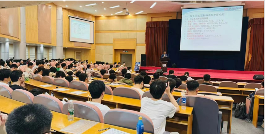 讲座伊始,黄老师剖析了公务员福利待遇与发展空间,从福利待遇、晋升空间为在座的同学们进行了详尽的分析和解读。随后,黄老师利用精心制作的表格,对江苏、上海、浙江、山东等城市的公务员考试时间、内容特色以及地区优势进行了详尽的分析。他系统地梳理了各地省考与国考的时间线,以及部分地区公务员岗位的待遇、户籍政策和晋升空间,使得整个讲座脉络清晰,逻辑严密。
