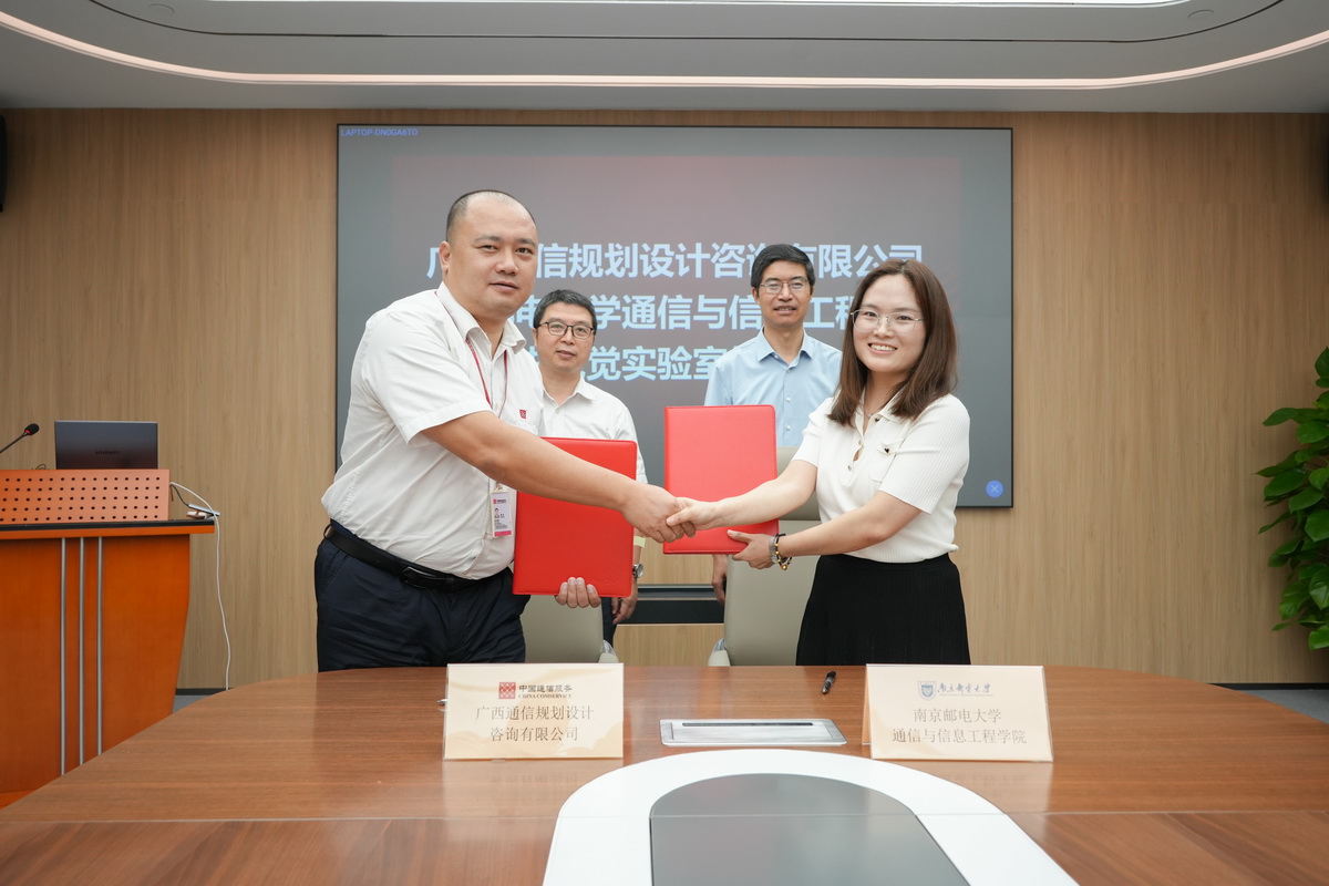 赵佳和庄文芹分别代表广西通信规划设计咨询有限与南邮通信学院签订了先进视觉智能实验室合作协议,黄耿总经理和徐雷书记共同见证签约并为实验室揭牌。双方将充分利用各自资源优势,提高在智能信息处理与智能通信建设方面合作的广度与深度,打造校企合作新模式,助推发展新质生产力。