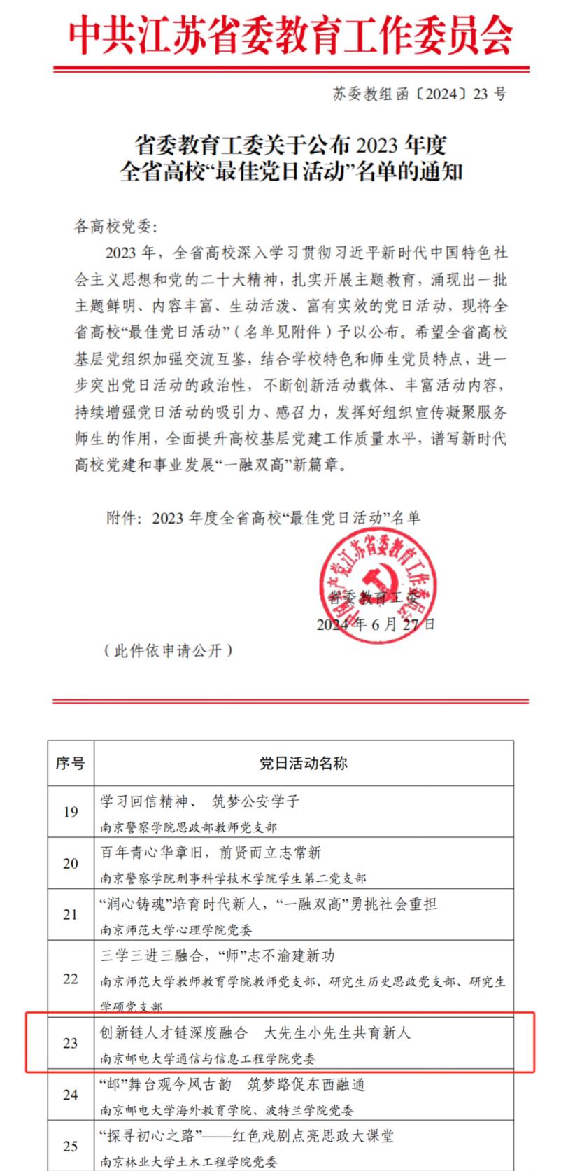 近日,江苏省委教育工委公布了2023年度高校“最佳党日活动”评选结果,公司党委报送的“创新链人才链深度融合 大先生小先生共育新人”主题党日活动获此殊荣。