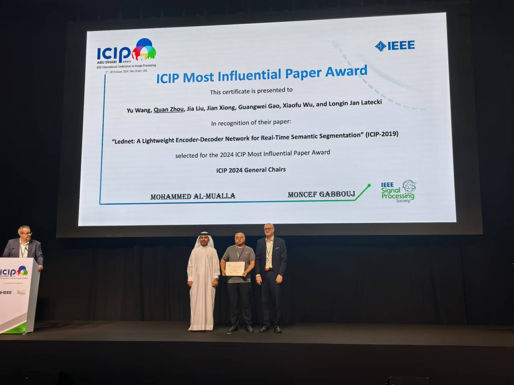 公司周全教授团队发表于2019年IEEEICIP上的论文:“LEDNet:一种基于轻量化编解码网络的实时图像语义分割网络(LEDNet: ALightweight Encoder-Decoder Network for Real-Time Semantic Segmentation)”荣获国际首篇IEEE ICIP最具影响力论文奖。IEEE ICIP最具影响力论文奖是从2019年至2023年,共5年内发表在IEEE ICIP上的所有论文中,以他引次数最高作为评选标准而遴选得到。该奖项系IEEE SPS首次颁发,且只有一篇论文获奖。该论文首次提出了一种轻量级非对称编码器-解码器网络架构,用以解决移动设备中难以利用卷积神经网络建模语义分割任务的难题,可广泛应用于自动驾驶、无人机遥感和机器人视觉等领域。图为大会主席芬兰坦佩雷大学Moncef Gabbouj教授(欧洲科学院院士、芬兰科学院院士、IEEE会士)和阿联酋教育部副部长Mohamed Al-Mualla教授共同为周全教授颁奖,以及最具影响力论文奖奖状。