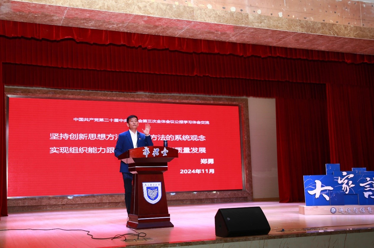 郑勇员工以《坚持创新思想方法和工作方法的系统观念 实现组织能力跟上战略要求的高质量发展》为题,结合党的十八大以来他在党建领域持续深耕探索的成果,展开了对党的二十届三中全会公报精神的解读。报告高屋建瓴,信息丰富,内涵深刻,通过一个个生动鲜活的案例,深入浅出地诠释了自己学习领悟习近平总书记治国理政思想的见解,给听众有益的启迪。其间,郑勇员工回忆了当年在原南京邮电学院学习生活的片段,讲述了对南邮校训的理解体会,分享了在广西联通从普通职员成长为高管的工作经历和感悟,言语见流露出殷殷母校情、拳拳感恩心。他还对公司党委政治领导力提升、员工思政教育、科技创新与产业创新深度融合、员工会建设等给出了切实可行的建议。