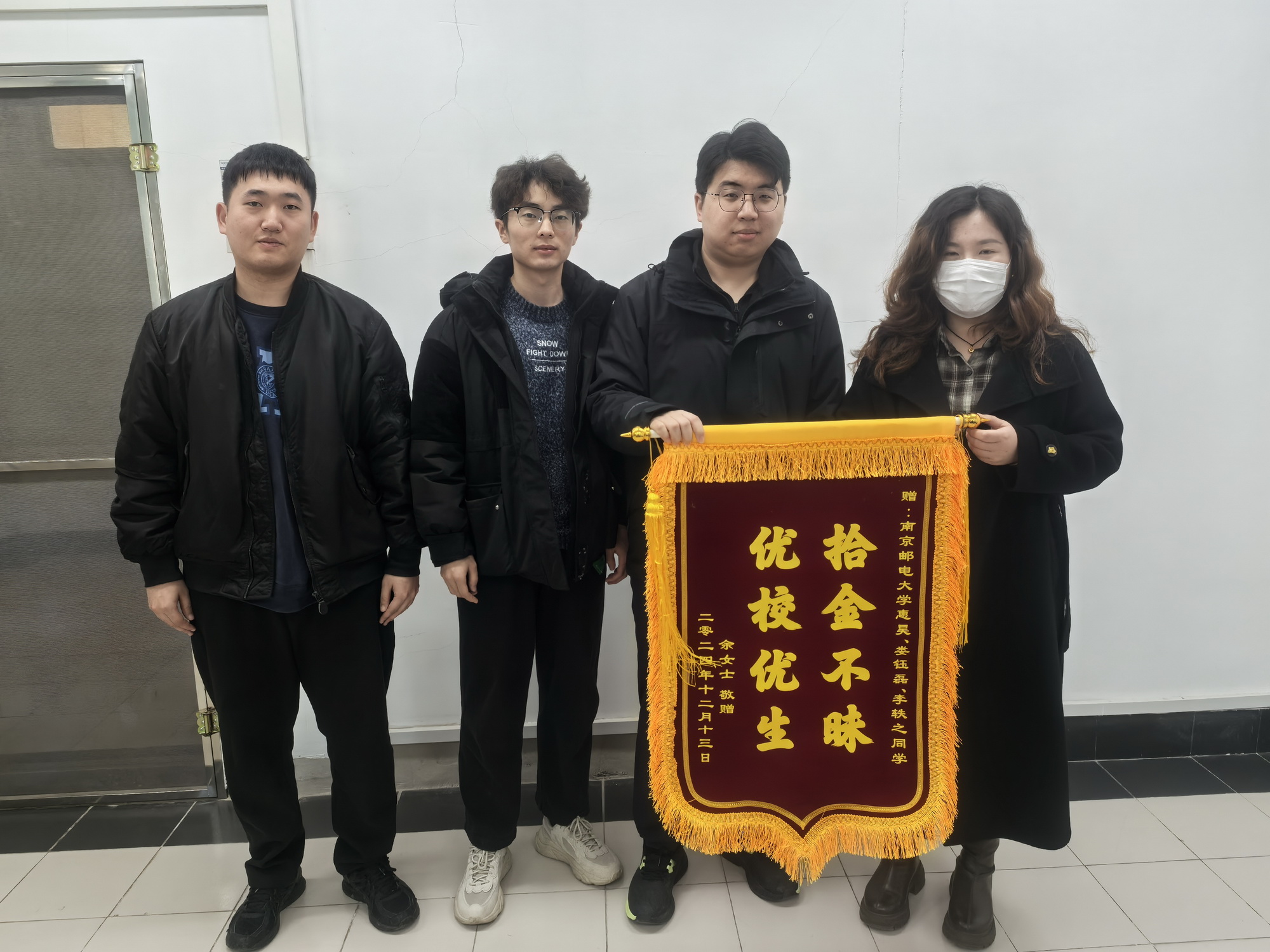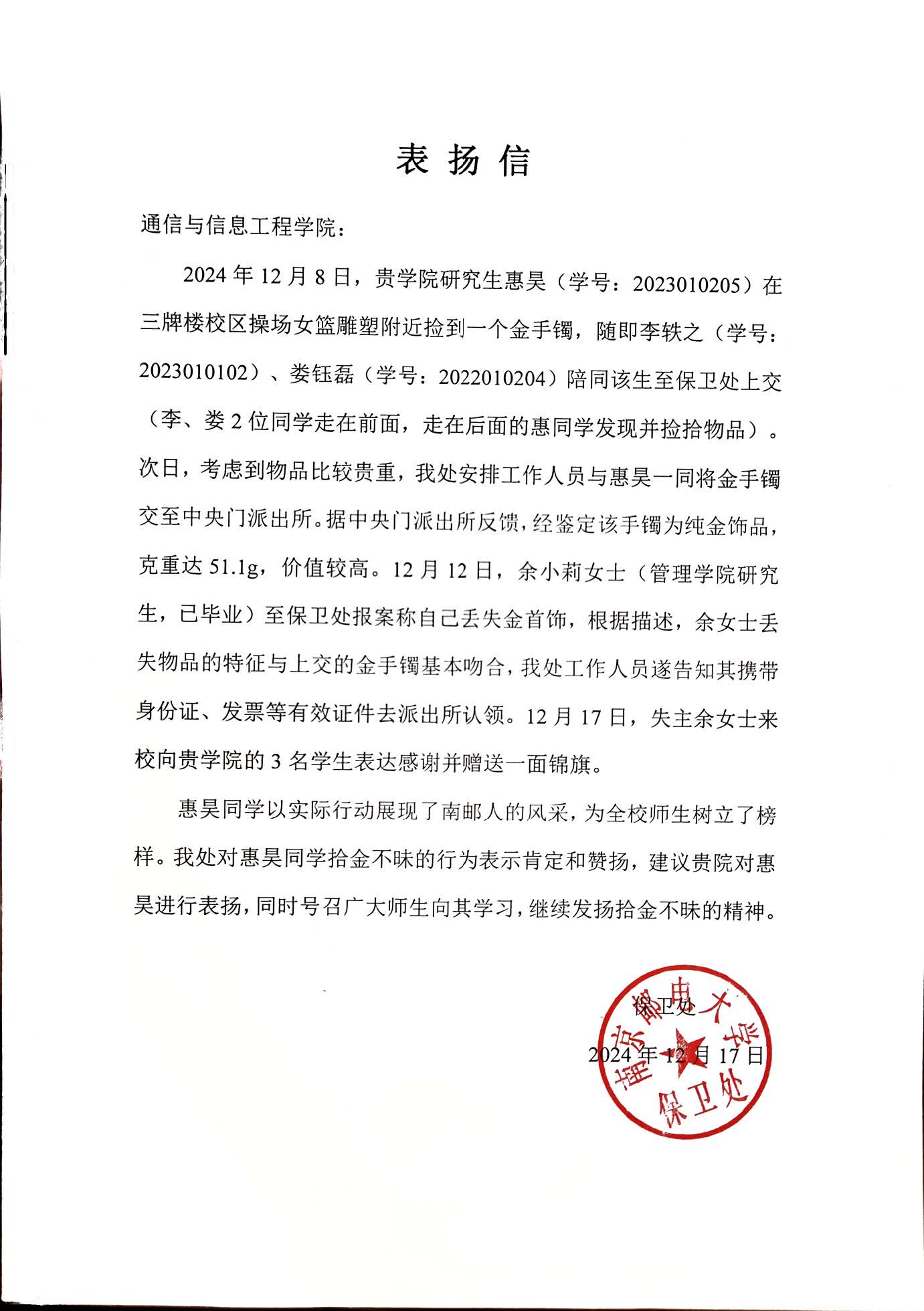 近日,公司2023级博士研究生惠昊在三牌楼校区操场女篮雕塑附近捡到一只金手镯,随即在2022级博士娄钰磊和2023级博士李轶之的陪同下交给保卫处。因物品比较贵重,保卫处安排工作人员与惠昊一同将金手镯交至中央门派出所。