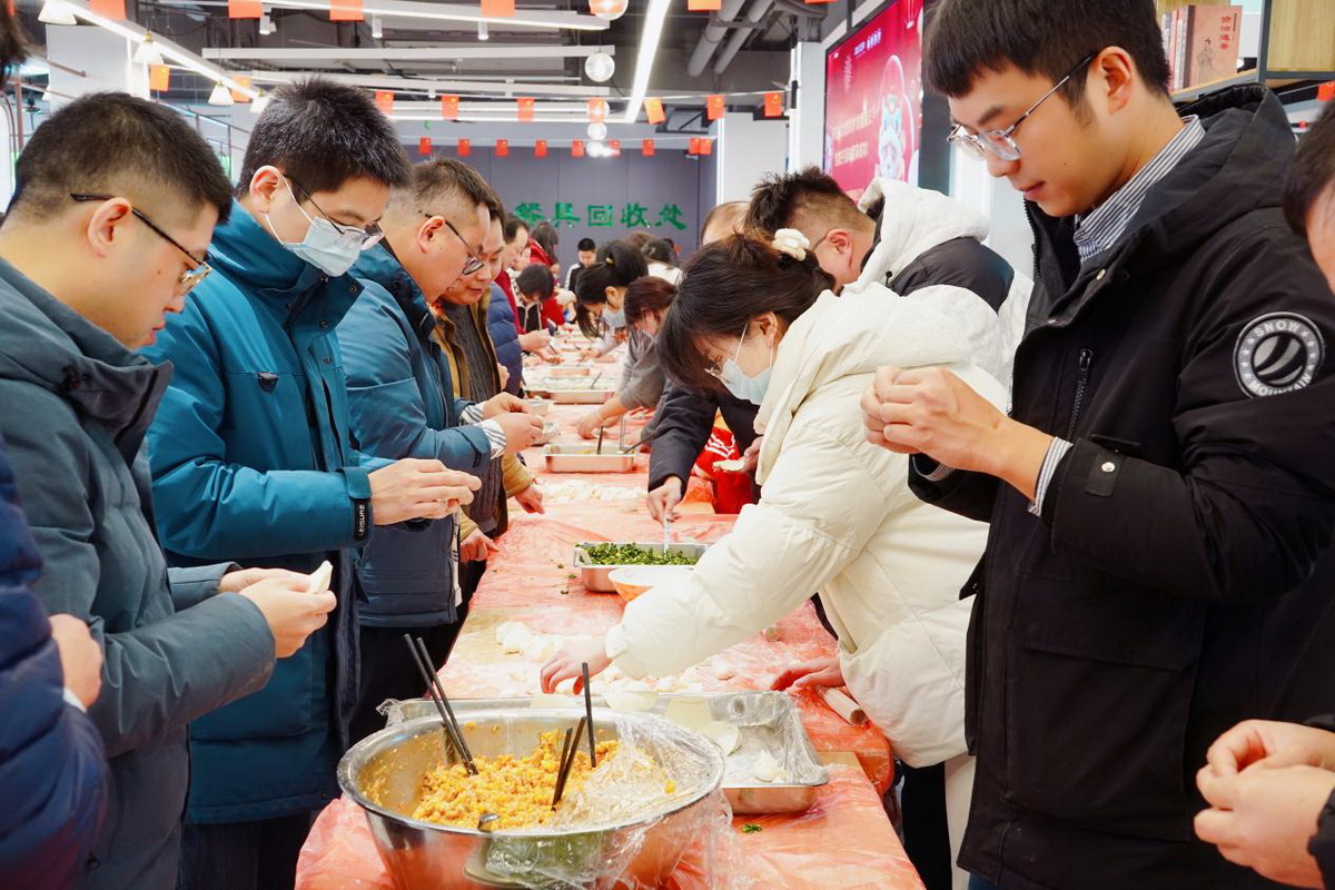 大屏幕上“金蛇贺岁 饺香情长”几个大字格外醒目,活动现场有着精心准备的水果、糕点,还有参与就可以获得的小礼品,处处洋溢着喜庆的气息。准备好的饺子馅、面皮等食材整齐地摆放着,散发着诱人的香味,仿佛在召唤大家动手一试。在欢声笑语中,大家纷纷围坐在一起开始包饺子。大家分工明确,配合默契,有的熟练地擀着饺子皮,有的细心地包着馅料,不一会儿,形态各异的饺子便摆满了餐盘。这些饺子或小巧玲珑,或敦实饱满,每一个都蕴含着教职工们对新年的美好期待。在父母的指导下,孩子们有模有样地学习包饺子。有的孩子认真地模仿着大人的动作,小心翼翼地将馅料放在面皮上,再努力地捏出饺子的形状,尽管包出的饺子形态各异,却充满了童趣。随后,热气腾腾的饺子被端上了桌,大家品尝着自己的劳动成果,脸上洋溢着幸福的笑容,感受着浓浓的年味和亲情的温暖。