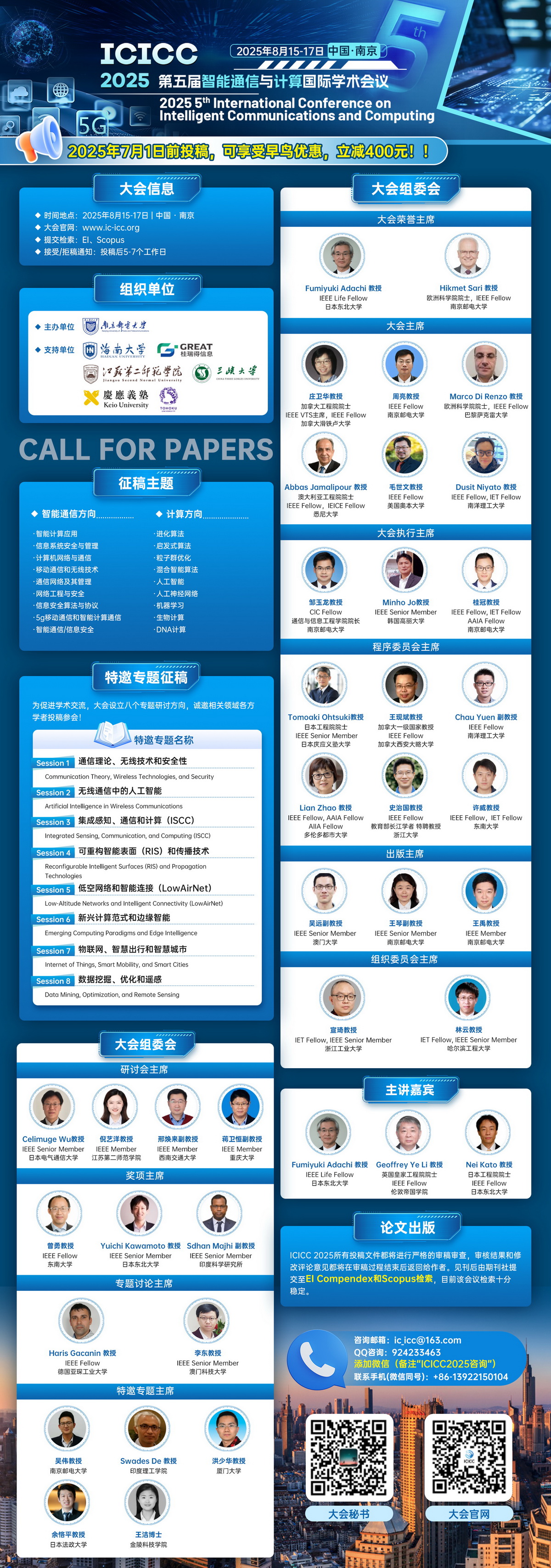 ICICC 2025将围绕“智能通信与计算”的研究领域,探讨其最新发展趋势、技术挑战及未来应用前景,特设八个专题研讨方向,大会诚邀国内外高校、科研机构专家、学者踊跃投稿和参会!