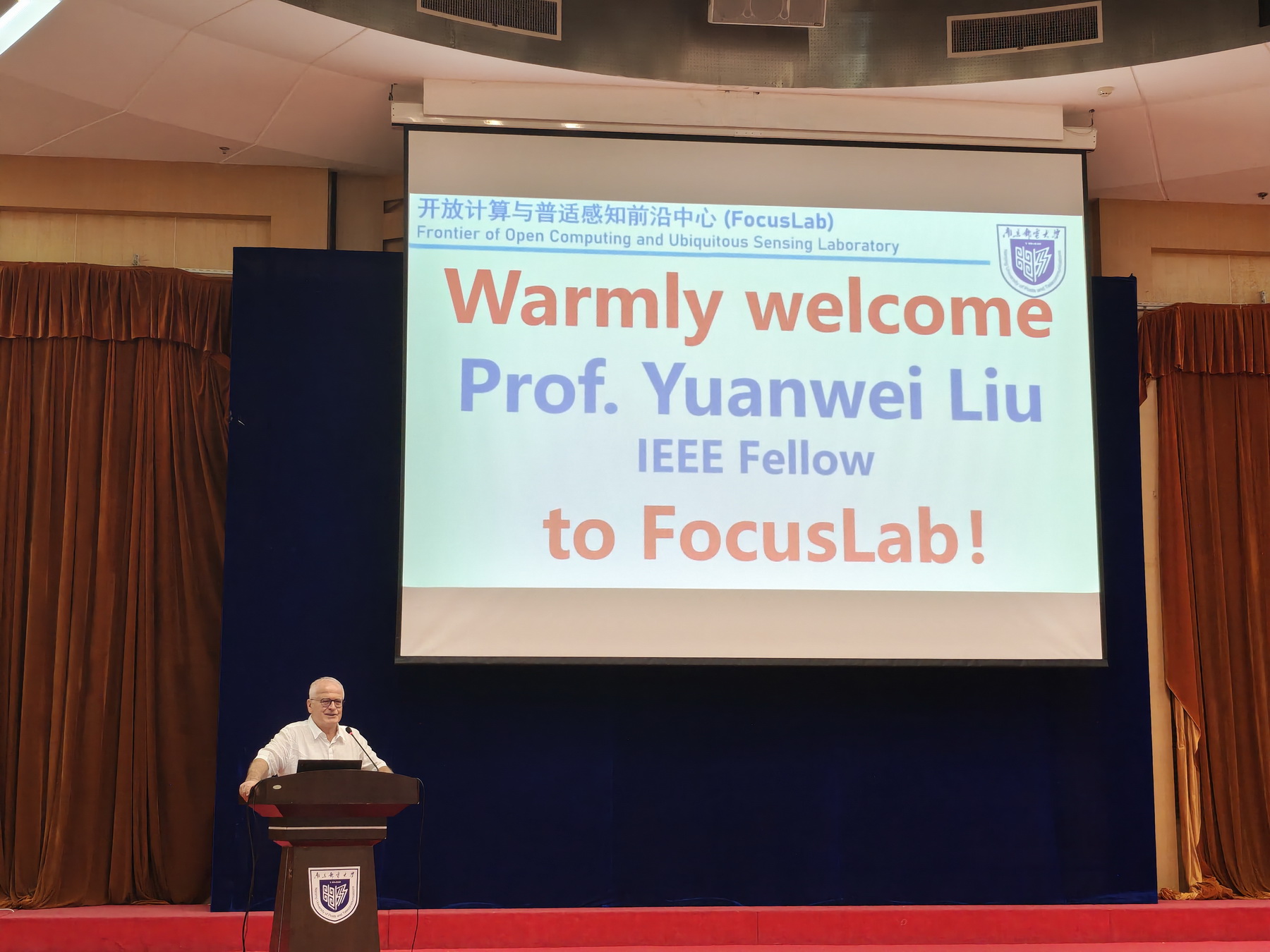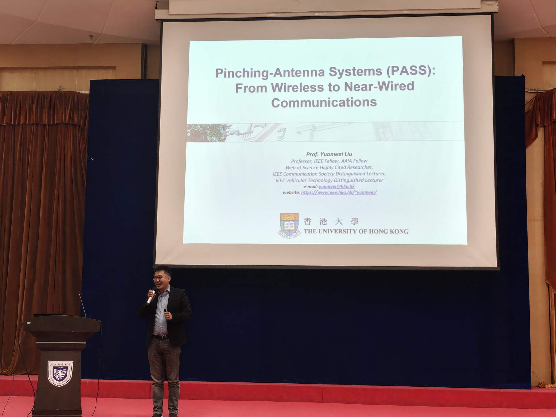 随后,Yuanwei Liu教授带来题为《Pinching-Antenna Systems (PASS): From Wireless to Near-WiredCommunications》的精彩演讲,介绍了一种突破传统天线结构限制的柔性压控系统。该技术通过增强视距连接、动态重构阵列和集成深度学习等手段,有效推动通信系统从无线向“准有线”演进。他结合多个案例展示PASS的应用效果,并展望了该技术在未来无线通信和感知融合场景中的发展前景。