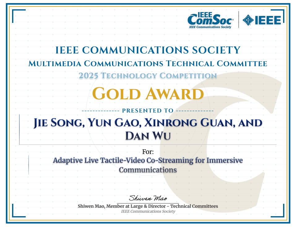 近日,IEEE通信学会旗舰会议——全球通信会议(IEEE Global Communications Conference, GLOBECOM)隆重召开,会上正式公布了 2025 年度 IEEE 通信学会技术竞赛的获奖名单。公司2023级博士生宋杰荣获智能多媒体流技术竞赛金奖(当年全球仅3项入选),指导教师为公司青年教师高赟博士。